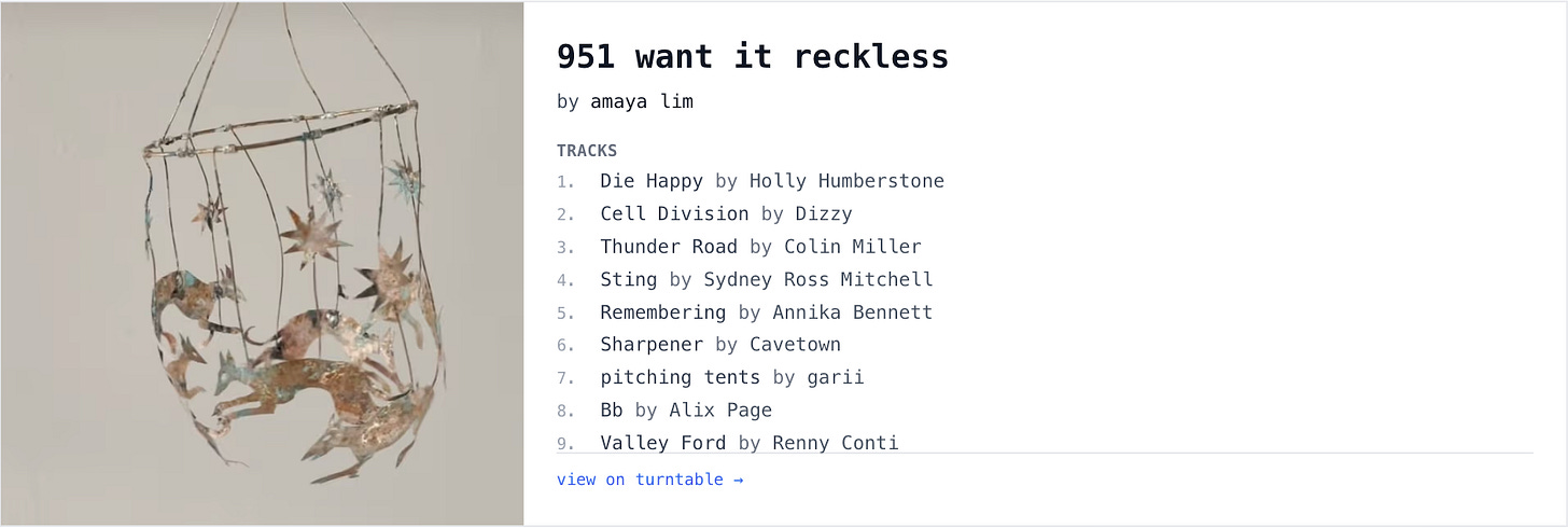 I’ve done a lot of work in my adulthood to merge these two selves, this newsletter being one big step towards taking my artistic practice seriously. Writing the songs that would become the first Bike Lane album was another big step, largely facilitated by the pandemic and the emotional devastation it afforded me (joking, sort of). In the last year, working on turntable has really brought forth a level of confidence I didn’t realize I was lacking until it appeared, allowing me to publicly grant my life shape and legitimacy that I didn’t before.
